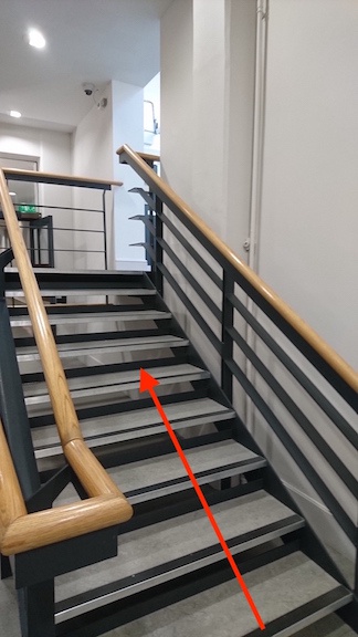 Walk up the flight of stairs, being careful not to collide with the other participants (not illiustrated) who will no doubt be as keen as you to scramble to the Symposium: