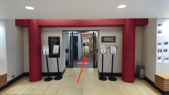 Once through, you'll spy a reception/help desk to the right of you. Keep walking straight, ignoring the lifts on your right: