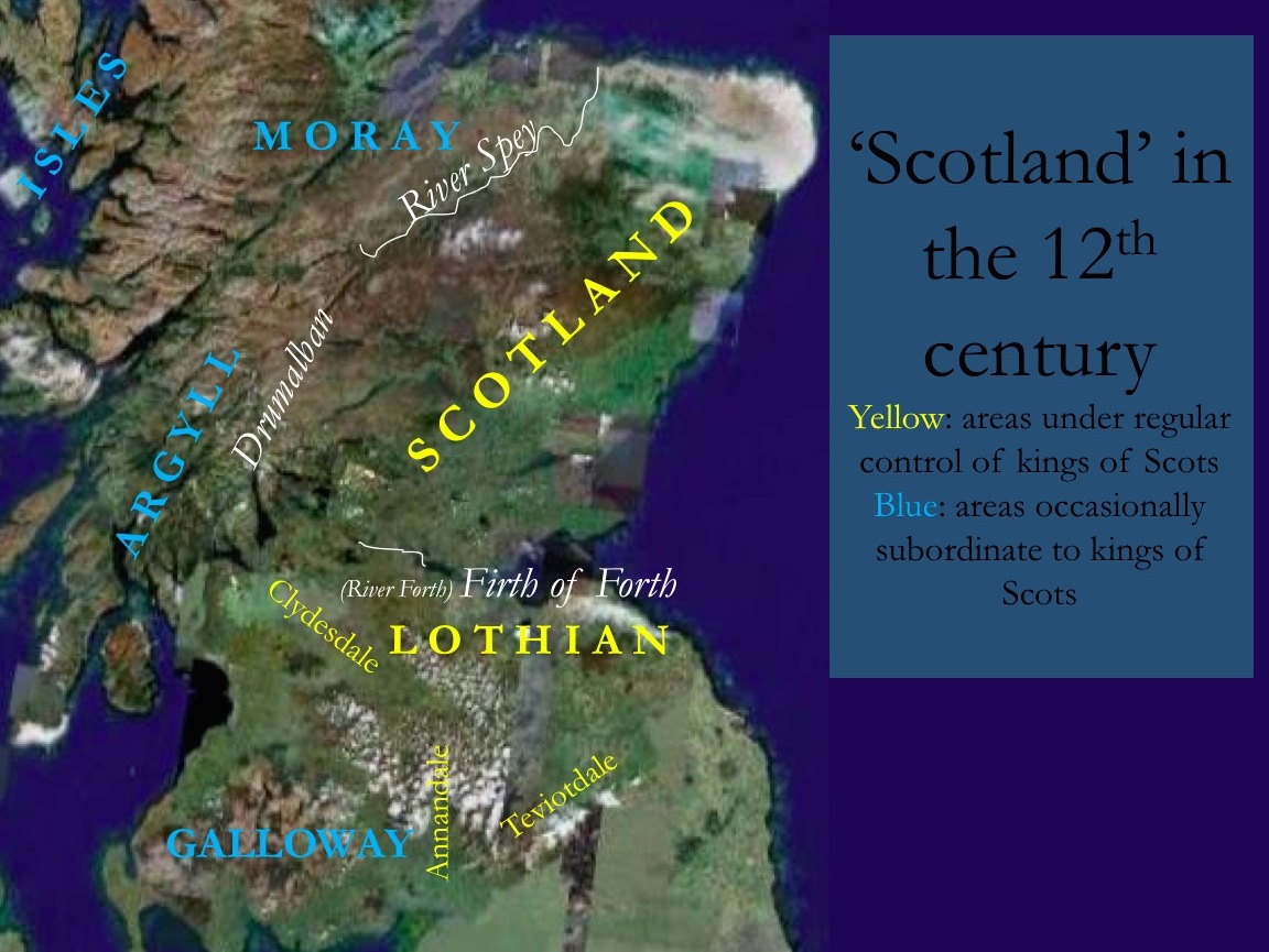 It appears, however, that it was only during the thirteenth century that kingdom and country were regularly thought of by its inhabitants as one-and-the-same. In the twelfth century, ‘Scotland’ did not denote the kingdom as a whole, but typically only the historic core between the Firth of Forth and River Forth, the River Spey and the mountain-range known as Drumalban.