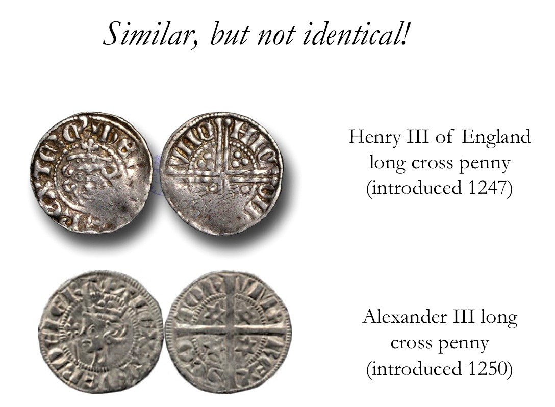 [16] For example, the long cross pennies introduced in 1250, modelled closely on the English long cross penny of 1247 (except that the king’s head is in profile rather than facing): J. D. Bateson, Coinage in Scotland (London 1997), 44.