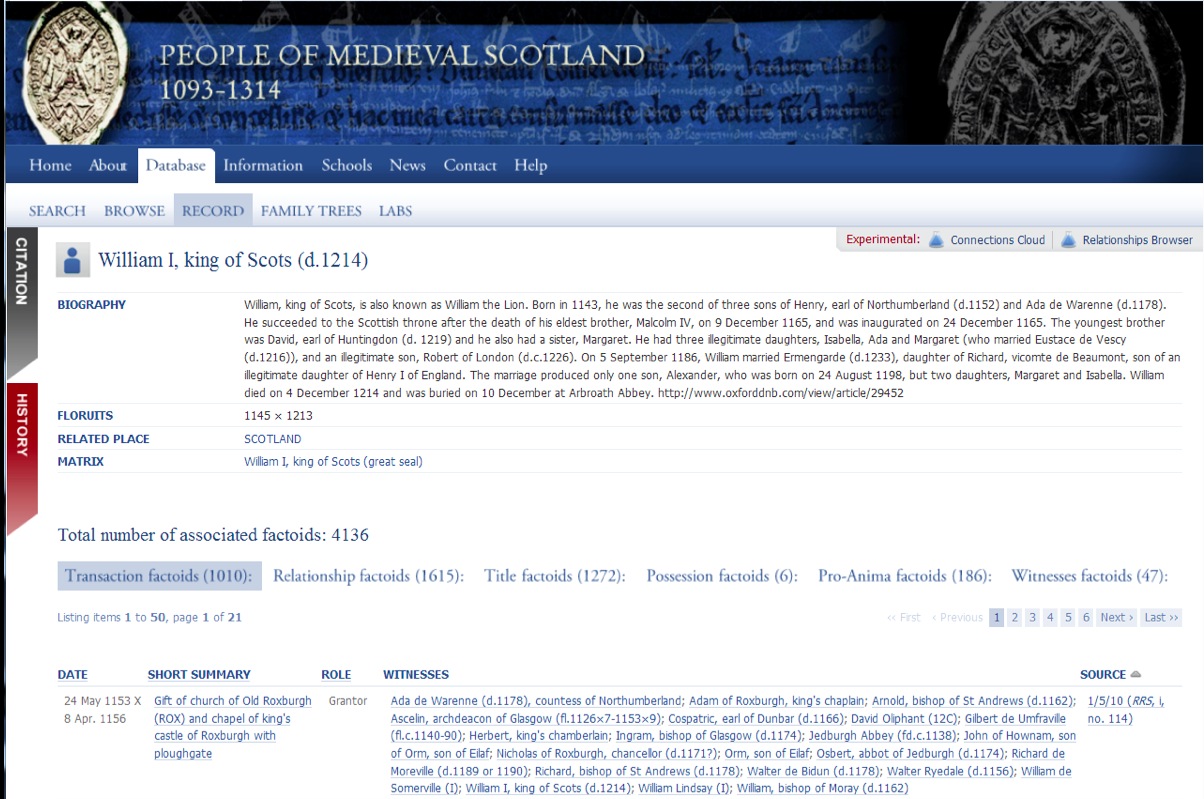 This database—called the ‘People of Medieval Scotland’ because of its primary concern for using charters as a source for social relationships—was developed between 2007 and 2012 with AHRC funding by John Bradley and Michele Pasin at King’s College London working with Matthew Hammond and others at the University of Glasgow.[17] It uniquely allows a kingdom to be viewed through all its charters in the critical period for the emergence of ‘continuous government’.