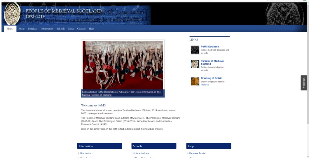 [17] Amanda Beam, John Bradley, Dauvit Broun, John Reuben Davies, Matthew Hammond, Michele Pasin with David Carpenter, Roibeard Ó Maolalaigh and Keith J. Stringer, and the assistance of Susan Bell, Kathryn Dutton, Nicholas Evans, Beth Hartland, Fergus Oakes and Andrew Smith, The People of Medieval Scotland, 1093–1314 (Glasgow and London 2012): www.poms.ac.uk.